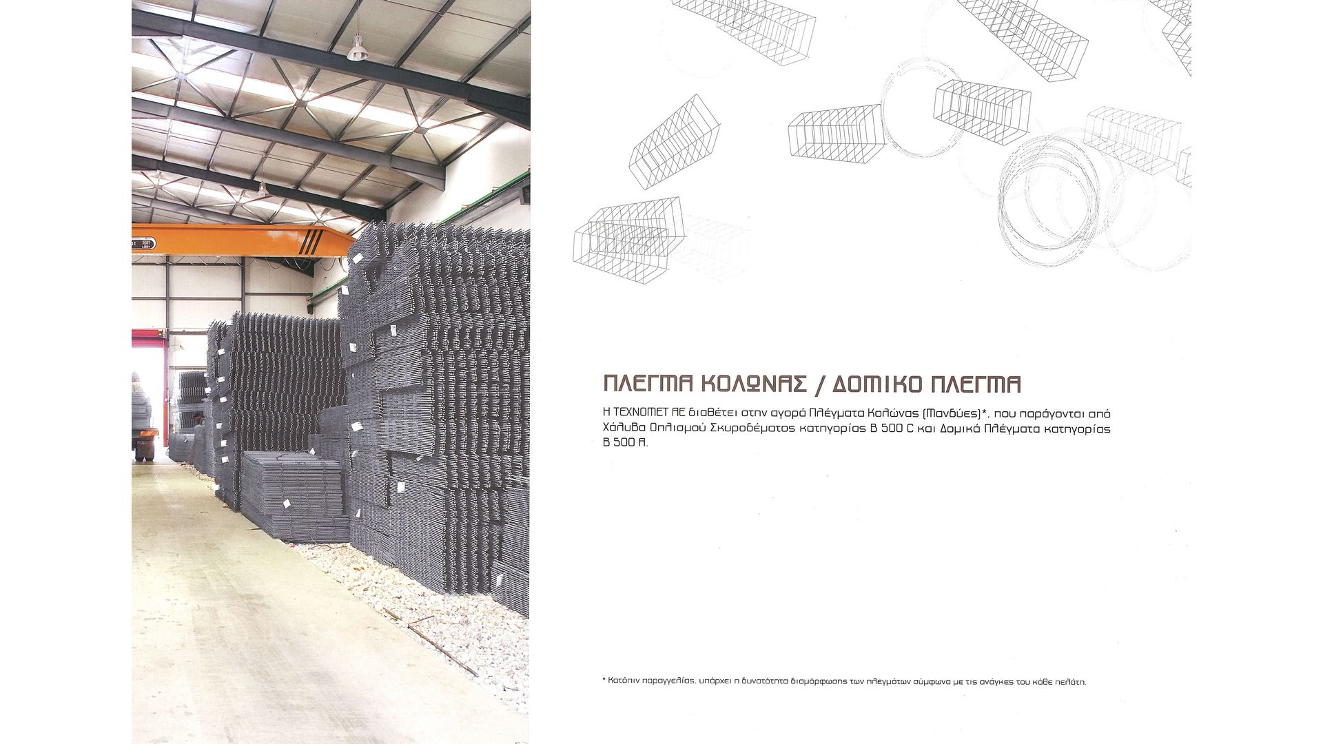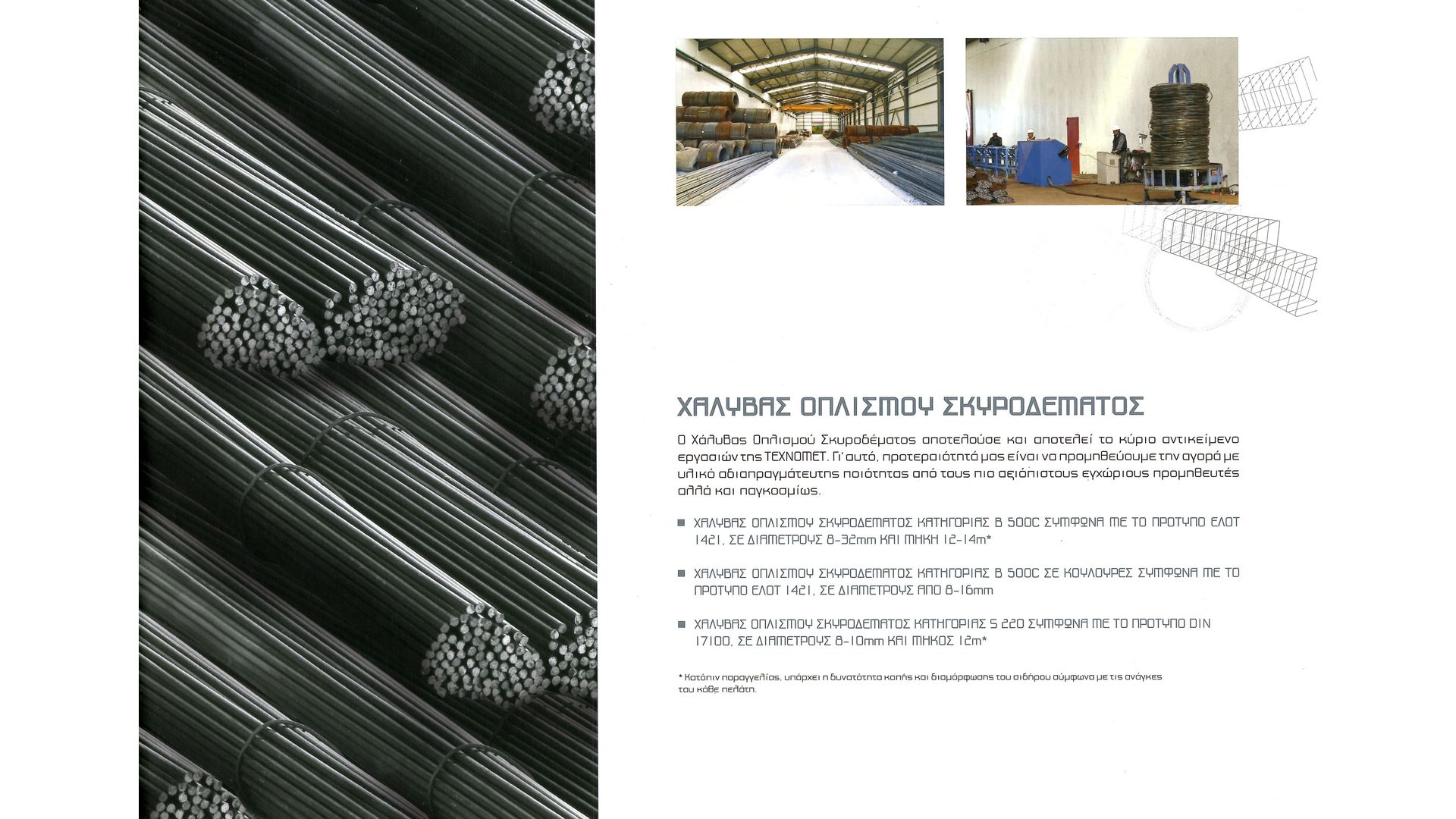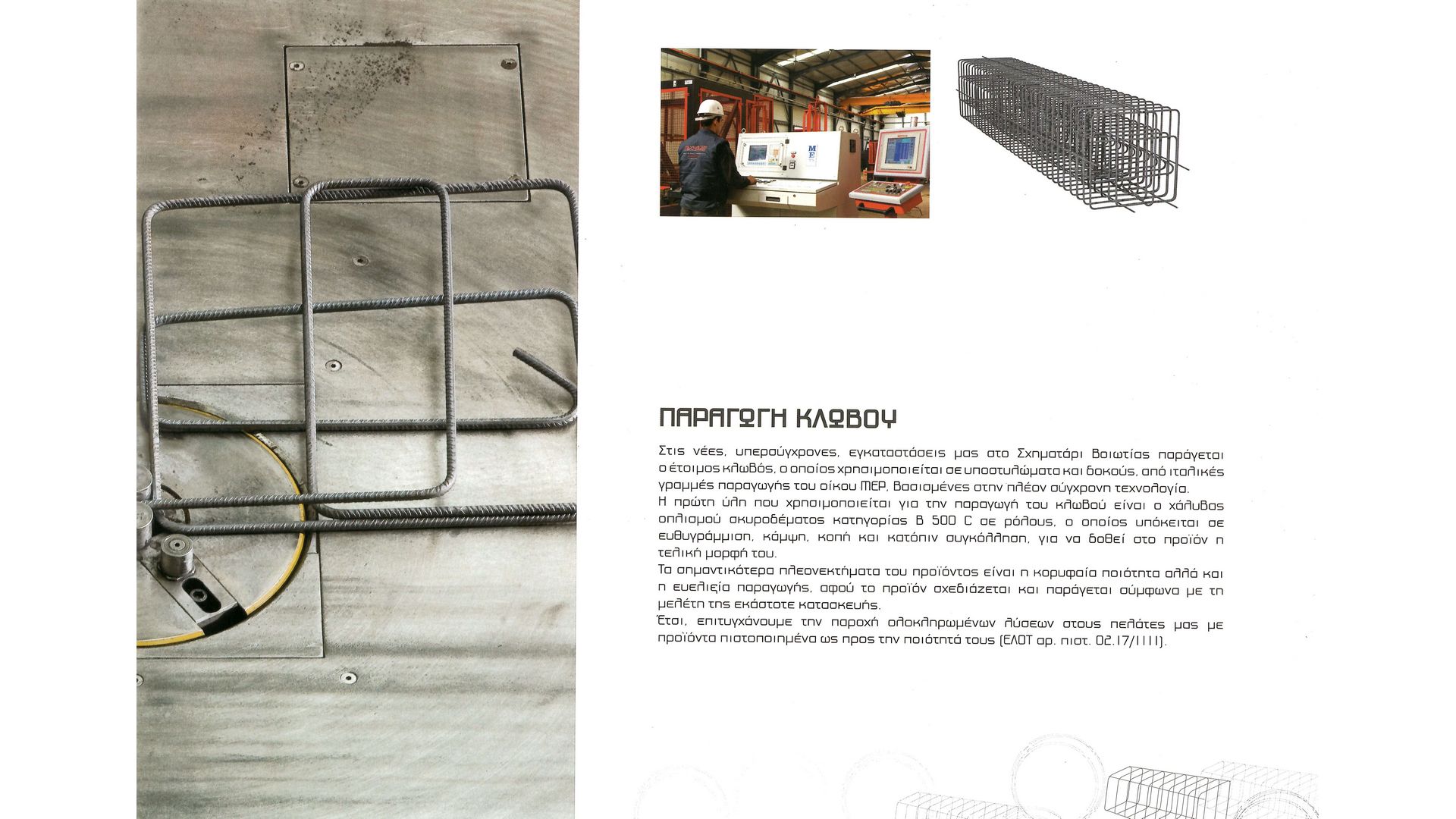 Το 2005, με μια σειρά επενδύσεων, δημιουργήθηκαν οι υπερσύγχρονες εγκαταστάσεις μας στο Σχηματάρι Βοιωτίας, εκτάσεως 32 στρεμμάτων με 11 στρέμματα στεγασμένους xώρoυς, όπου λαμβάνει χώρα η διαμόρφωση του χάλυβα οπλισμού σκυροδέματος καθώς και η παραγωγή κλωβών.